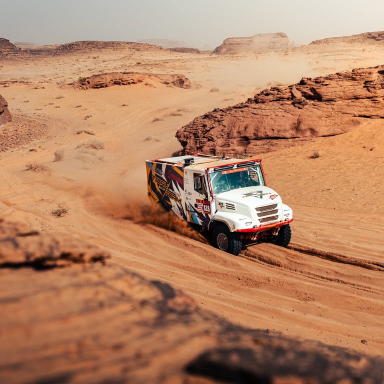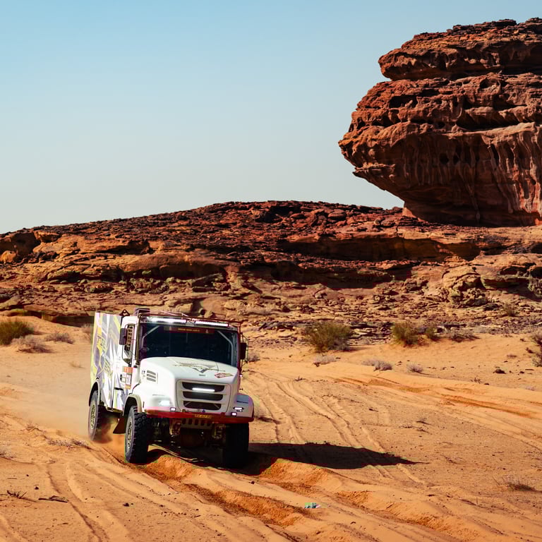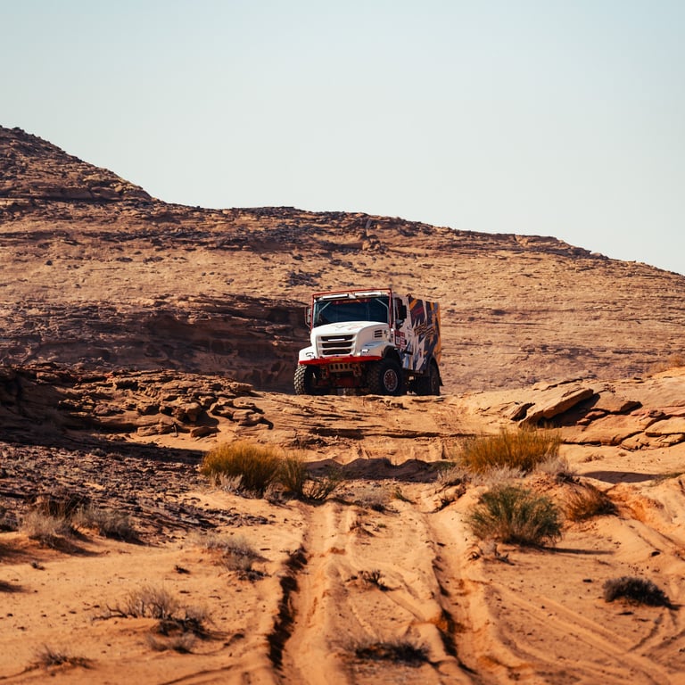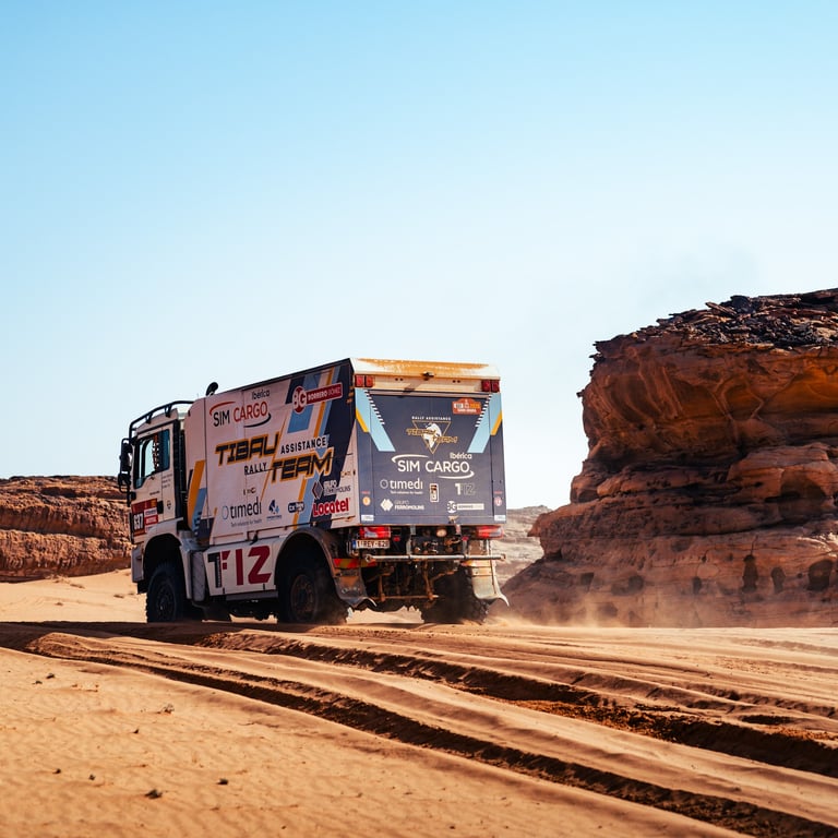 Desde primera hora, la jornada se planteó como especialmente exigente. Los cinco camiones del equipo rodaron juntos, cargados al máximo, con el objetivo de poder transportar piezas y neumáticos destinados a los equipos Dacia y Defender. Todo ello dentro de la estructura del Tibau Team, responsable de la asistencia oficial a ambos equipos en el Dakar. En una etapa maratón, sin asistencia externa al final del día, la autosuficiencia, la logística y el trabajo colectivo resultaron fundamentales.